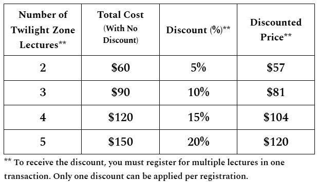 Discount rates for signing up for multiple Twilight Zone lectures.